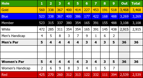 The nine-hole courses are The Red Course The White Course and The Blue Course.